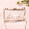 Clutch Purses with the brides future last name is an ideal personalized gift for the bride to be! The perfect bridal shower gift she can use on her honeymoon and after the wedding too. Each acrylic cross body purse comes with a removable chain. Printed with a monogram initials or name in pretty vinyl lettering. These acrylic clutch aren’t limited to bride only, you also can use it for wedding, bachelorette party favor, engagement, honeymoon and even for yourself or any girls who like cute things! Purses come with a clasp closure and gold hardware.